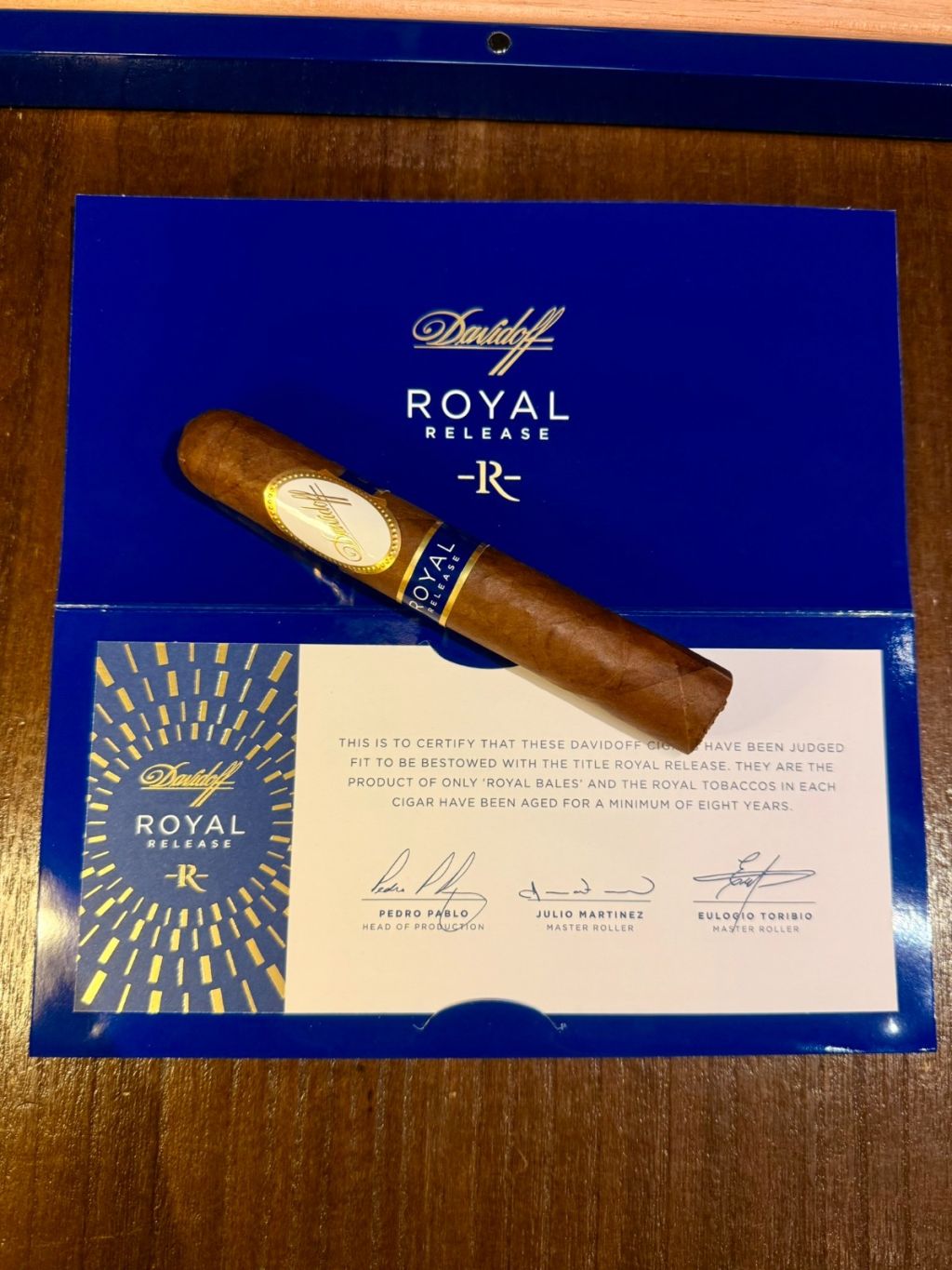 Royal Release 於 2016 年隆重推出,代表著 Davidoff 的極致工藝與稀有原料的結晶。其所用菸葉來自「特選皇家田(Royal Field)」——專為此系列而設的獨立園區,經過專屬發酵與長期熟成,僅由最資深的 8 位工匠負責手工製作。每片茄葉最少陳化八年,從菸葉培育致成形,歷時超過 10 年,由閃亮無花紋的高貴皇家藍色木盒 承載。Robusto 型號以優雅平衡著稱,煙氣順滑,層次遞進細膩,展現出 Davidoff 罕見的奢華深度。這並非日常的雪茄,而是一場「皇家級」的味覺儀式。
