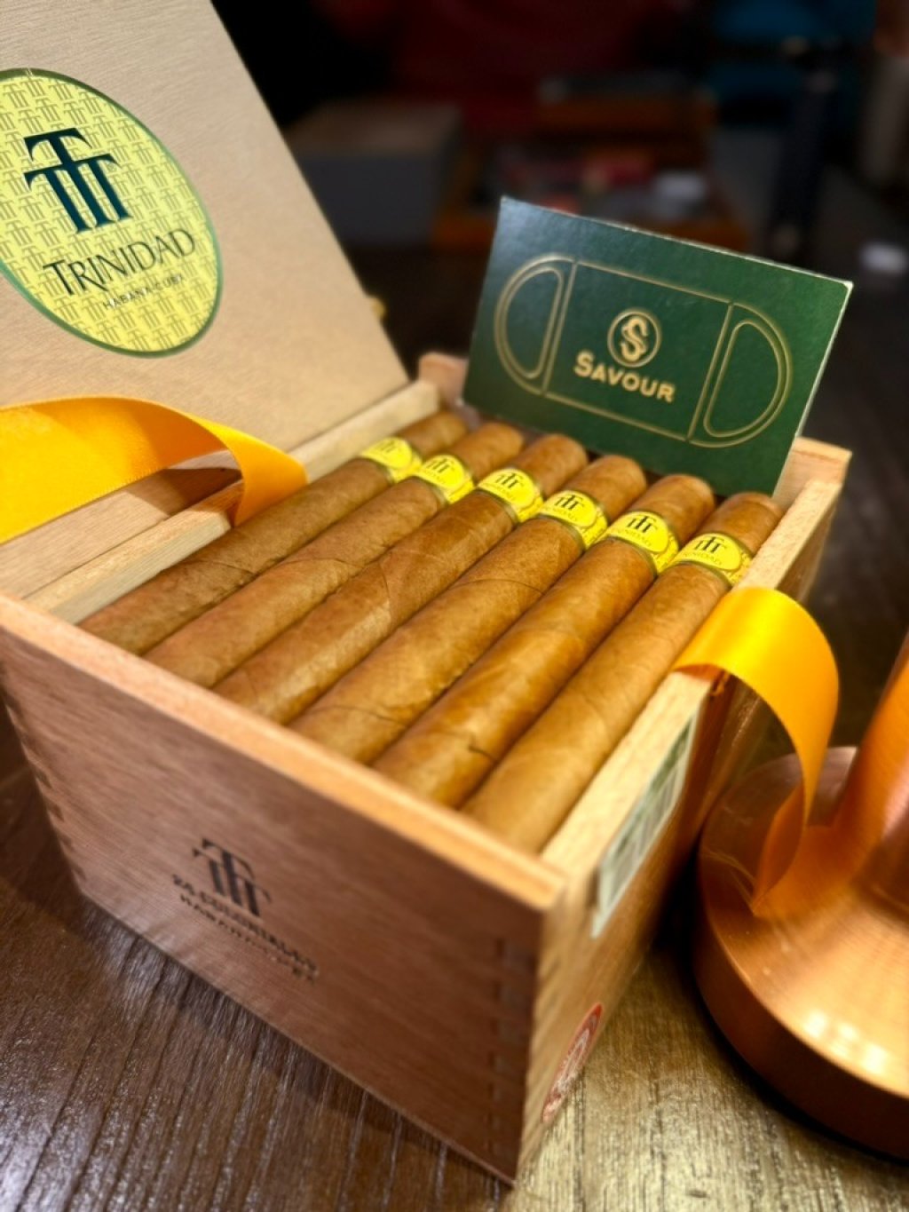 該雪茄以選自 Vuelta Abajo 地區的頂級菸葉製成,全手工長填料結構,維持品牌一貫的高品質水準。木盒包裝設計典雅,每盒包含24枝,並飾以象徵品牌尊榮的金色絲帶。Coloniales 的口感細緻、香氣高雅,煙氣溫潤,節奏柔順,展現 Trinidad 對平衡與深層香氣的極致掌握。