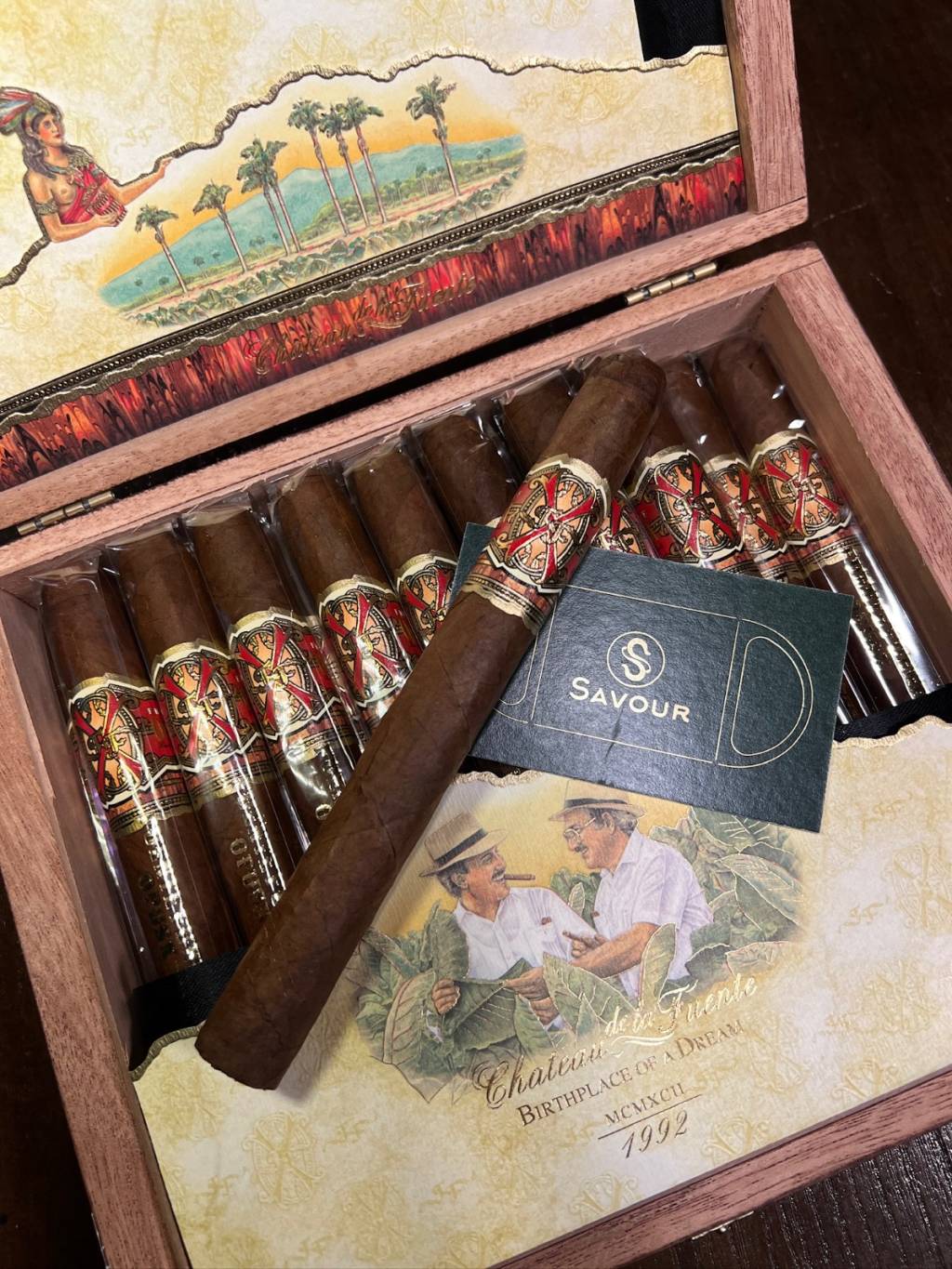 Reserva d'Chateau 是 OpusX 系列中的經典型號,「d'Chateau」意指「來自莊園」,強調其茄葉全部源自 Chateau de la Fuente 莊園頂級的太陽種植玫瑰色茄葉(Sun Grown Rosado),亦是提供濃郁且豐富風味的秘密武器。每枝均由專屬捲茄師以Entubado方法捲製,核心在於為每片填充葉提供獨立氣道,確保燃燒平均及通道暢順。由於卷制方法複雜,講求精湛的技術及費時,一般只使用於珍貴的雪茄。