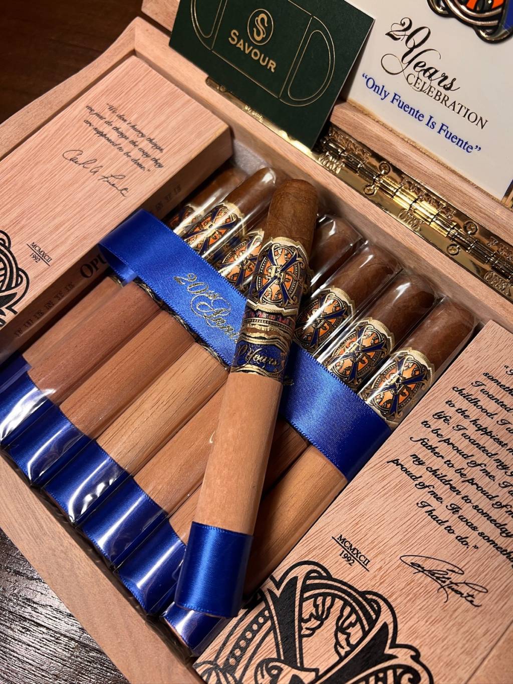 有別於經典 OpusX 的強勁辛辣風格,20 週年系列採用自家莊園經過深度陳年的第三層葉片(較低層採摘),呈現較淺棕色調,展現出更為細膩、平衡且優雅的中等濃度風味 。每支雪茄均以藍色絲帶及雪松木片包裹茄腳,並配有金藍雙環帶設計,限量生產且每年僅少量配額供應 ,十分稀有。